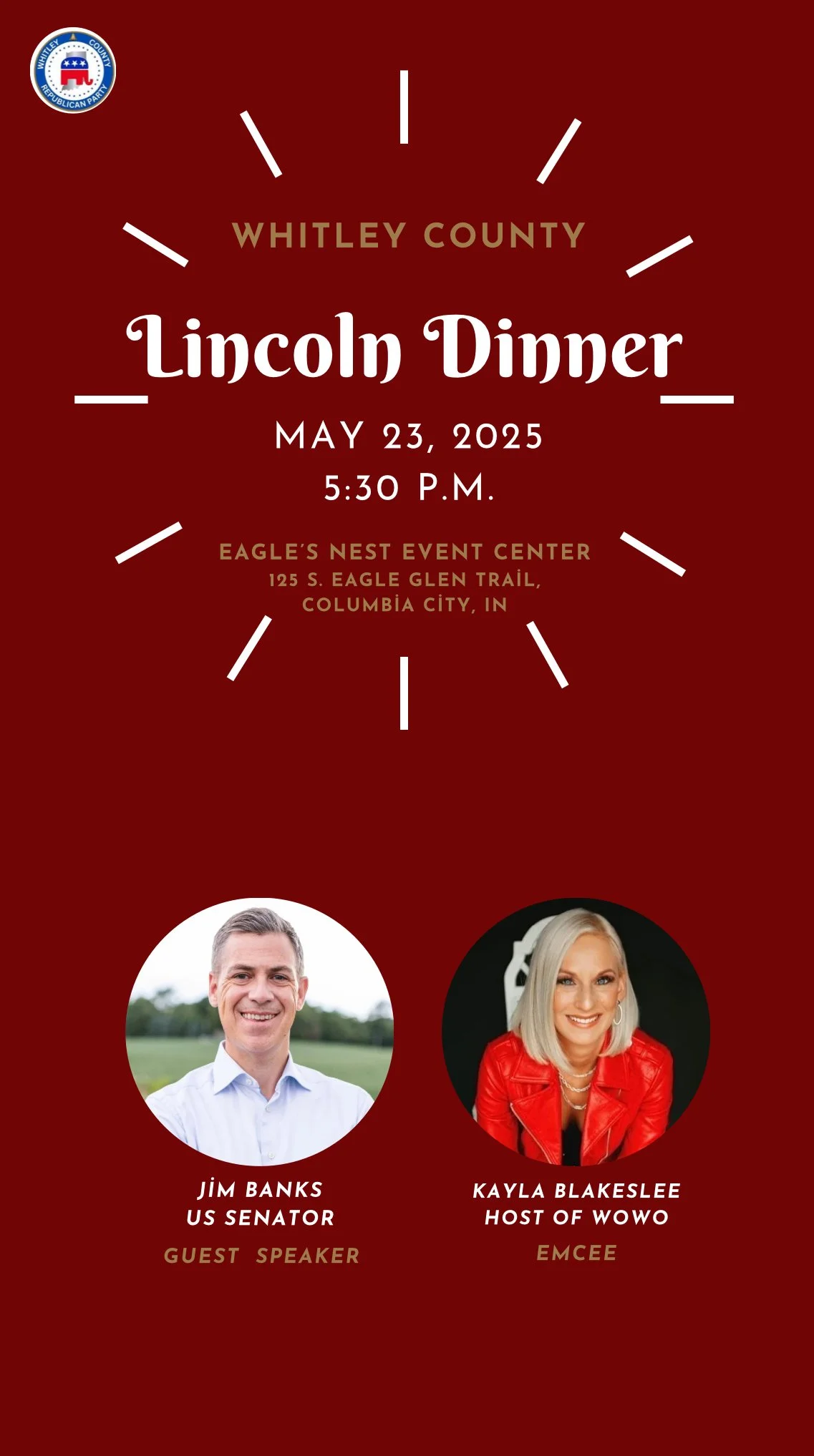 2025 Whitley County Lincoln Day Dinner Friday, May 23, 2025 5:30 PM 8:30 PM Eagles Nest Event Center 125 South Eagle Glen Trail Columbia City, IN, 46725 United States (map) Google Calendar ICS **Online payment no longer in service, limited seats remaining. Please contact 260-229-9902 and or 260-229-0271 to discuss with Whitley Leadership if you are still interested in booking a last minute reservation.